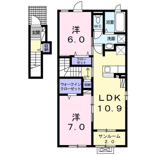 間  取 2LDK(洋:7帖×1/6帖×1 LDK:10.9帖 )